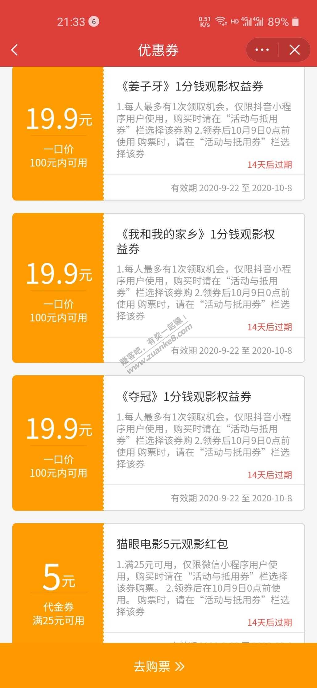 抖音安卓端~我~右上角三个点~小程序,搜猫眼电影,首页横幅最后一条,付1分买100以内资格券