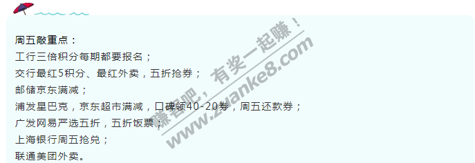 9月25日周五,银行活动汇总,敲重点!交行最红5积分、最红外卖,五折抢券等