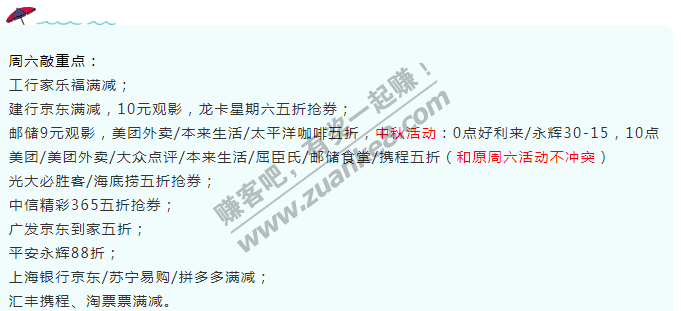 邮储9元观影,美团外卖/本来生活/太平洋咖啡五折,中秋活动:0点好利来/永辉30-15,10点美团/美团外卖/大众点评/本来生活/屈臣氏/邮储食堂/携程五折(和原周六活动不冲突)