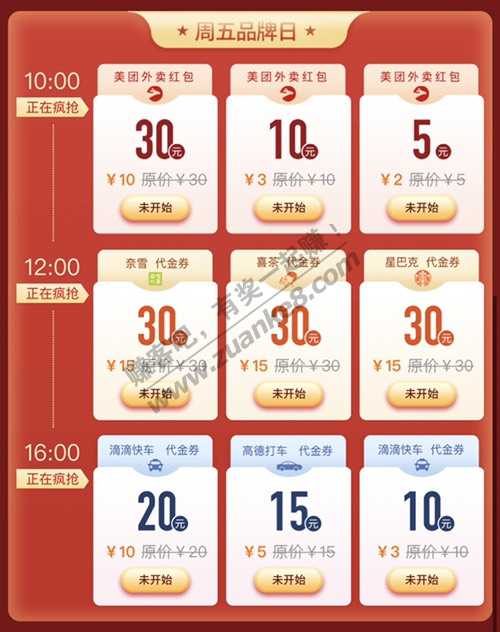 (2)商品包含:10:00商品包含美团外卖满30减30、满10减10、满5减5红包;12:00商品包含为喜茶30元代金券、奈雪的茶30元代金券、星巴克30元代金券;16:00商品包含滴滴快车20元券、高德打车15元代金券、滴滴快车10元券;