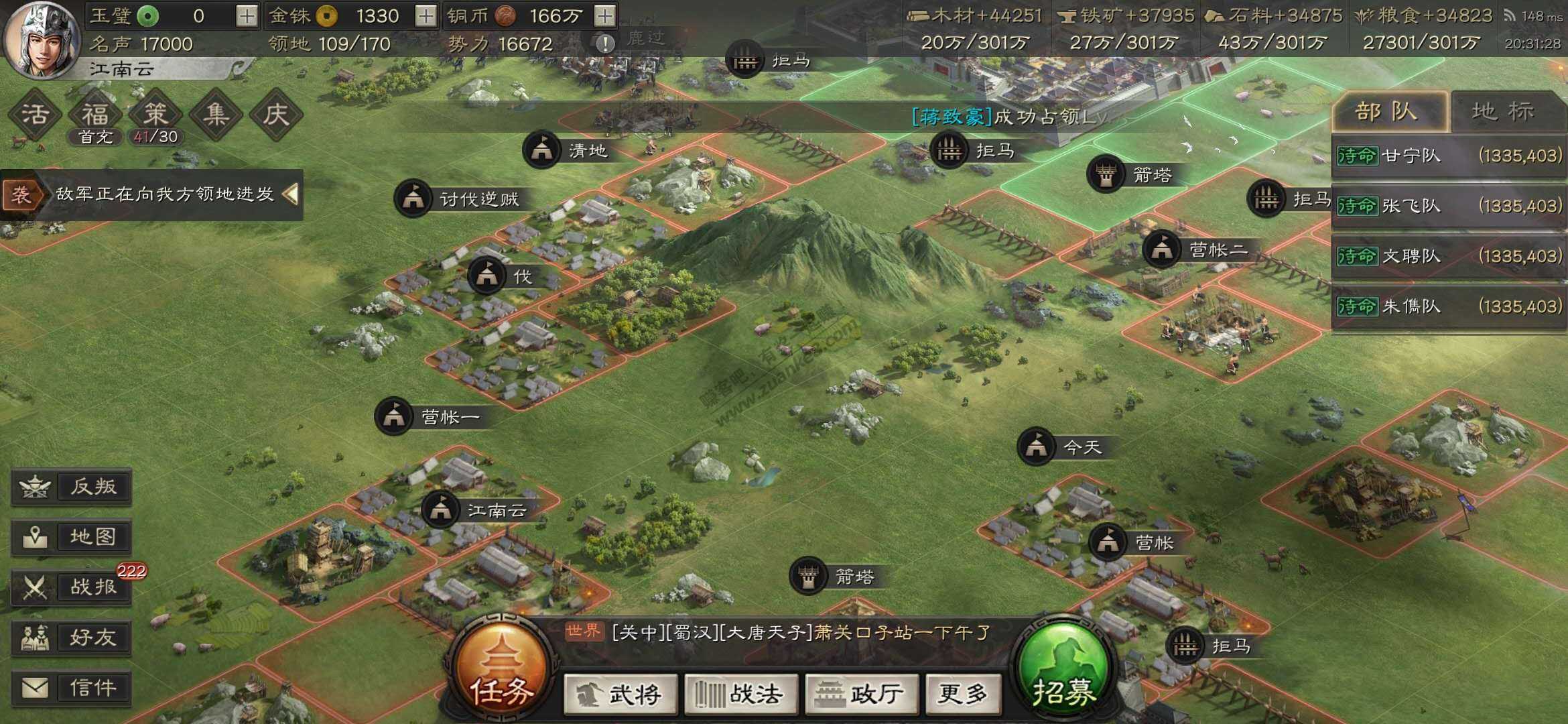 还有一个家伙,分城落下来就给我五六块高级地给打了,都是六七级铜矿,打了也就算了,还要来打我盟里的城,太霸道了,就驻守给打跑了,完了跑到群里去说我欺负他,拉一堆人过来。