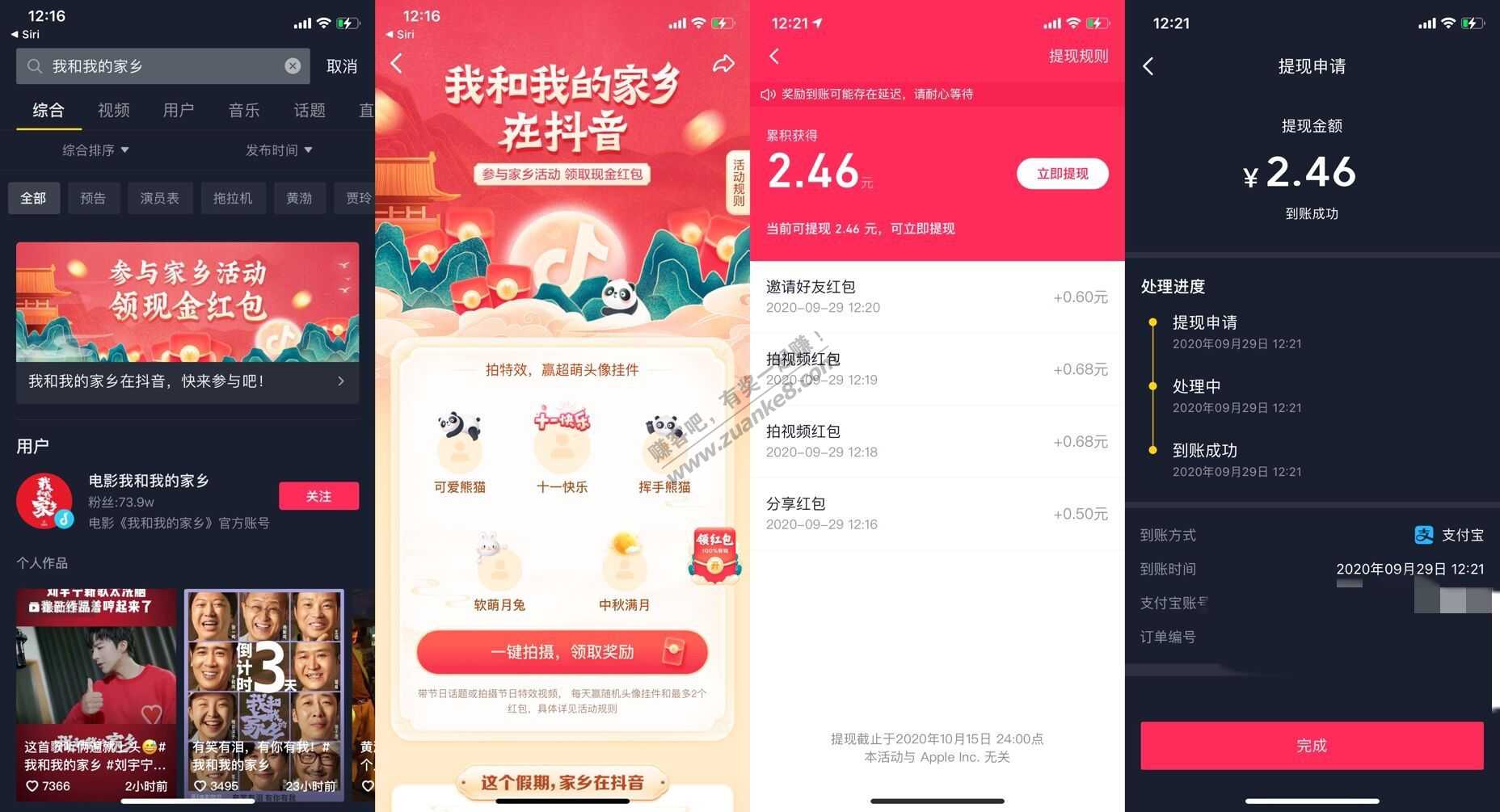 【抖音老用户领2~3元红包】抖音APP搜索“我和我的家乡”->点横幅进去后点右边红包->任务很简单->全完成加起来大概有1.9元左右->然后找1~2个朋友互助下差不多就够2元能提了