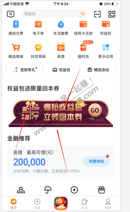 沃钱包领20银联券,吧码套 沃钱包APP 首页,回本券