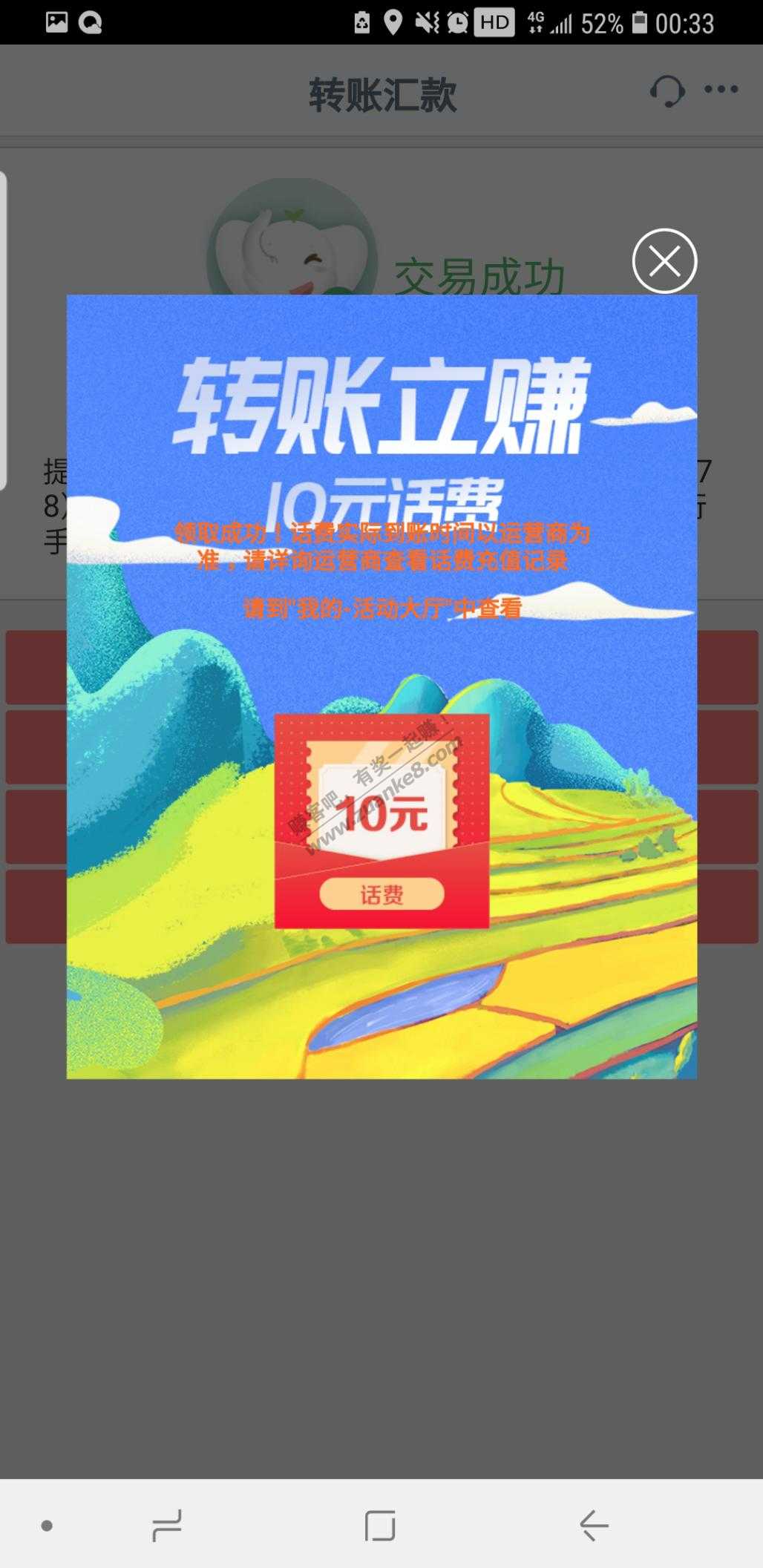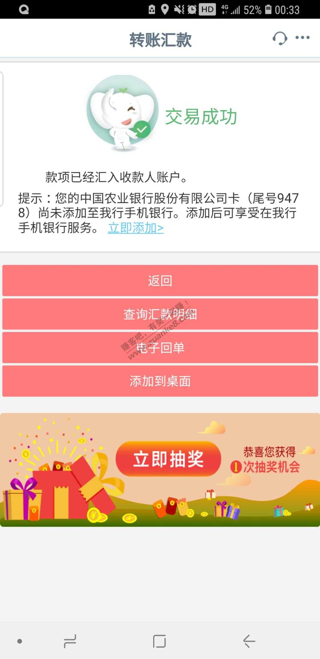工行真给力,转账100又抽了10话费