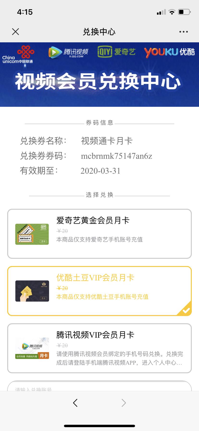微信关注公众号沃行校园,关注好了就会推送一条消息,点进去刮奖,一般二次机会中一个月视频会员 优酷爱奇艺腾讯三选一