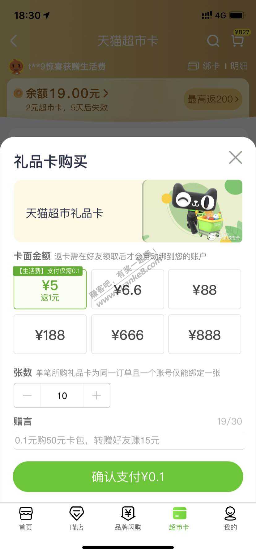 天猫超市0.1买15超市卡又有了,上吧!