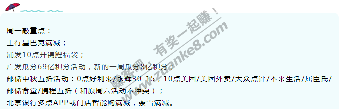 10月5日周一,银行活动汇总,敲重点!北京银行多点APP或门店智能购满减,奈雪满减。