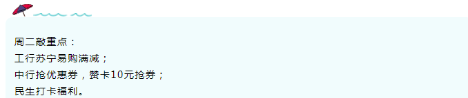 10月6日周二,银行活动汇总,敲重点!工行苏宁易购满减;中行抢优惠券,赞卡10元抢...