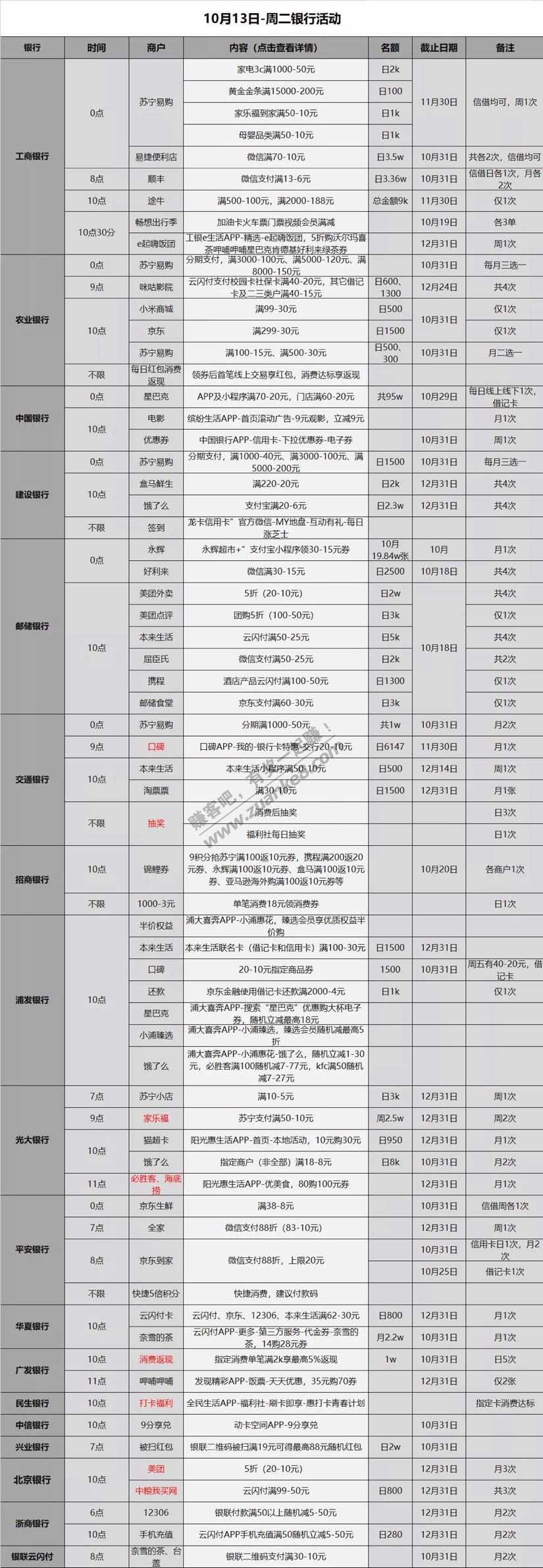10.13各大银行薅羊毛活动分享