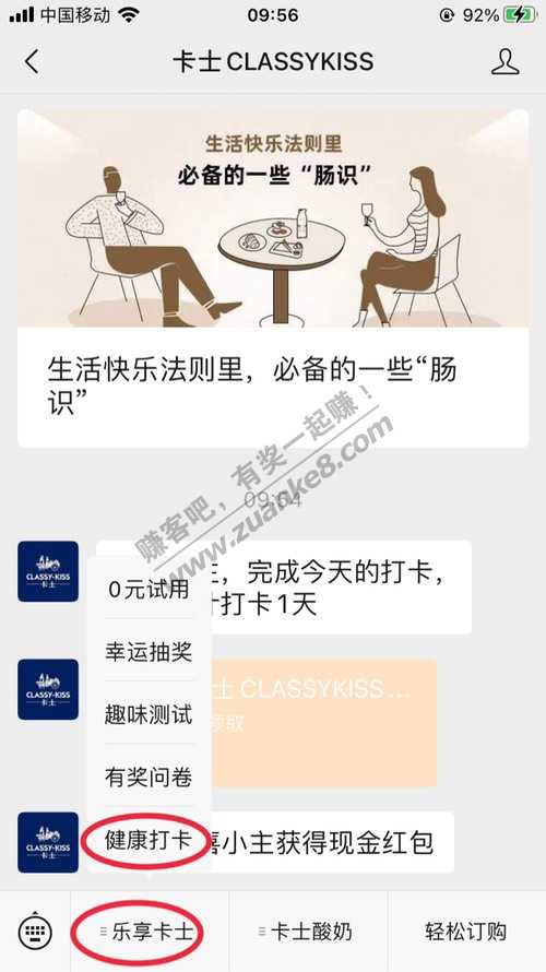 微信关注【卡士CLASSYKISS】点击菜单栏【乐享卡士】-【健康打卡】