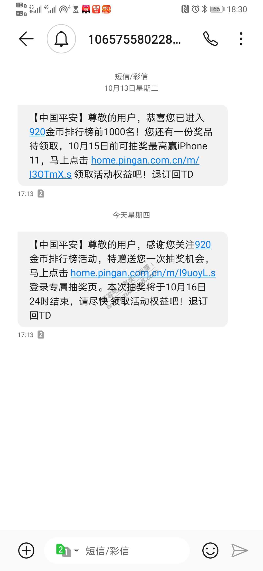 【中国平安】尊敬的用户,感谢您关注920金币排行榜活动,特赠送您一次抽奖机会,马上点击 home.pingan.com.cn/m/I9uoyL.s 登录专属抽奖页。本次抽奖将于10月16日24时结束,请尽快 领取活动权益吧!退订回TD