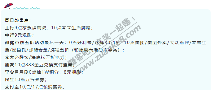 邮储中秋五折活动最后一天:0点好利来/永辉30-15,10点美团/美团外卖/大众点评/本来生活/屈臣氏/邮储食堂/携程五折(和原周六活动不冲突);
