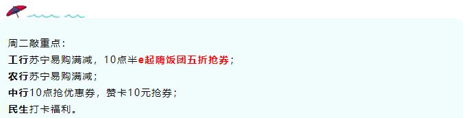 周二敲重点:工行苏宁易购满减,10点半e起嗨饭团五折抢券;