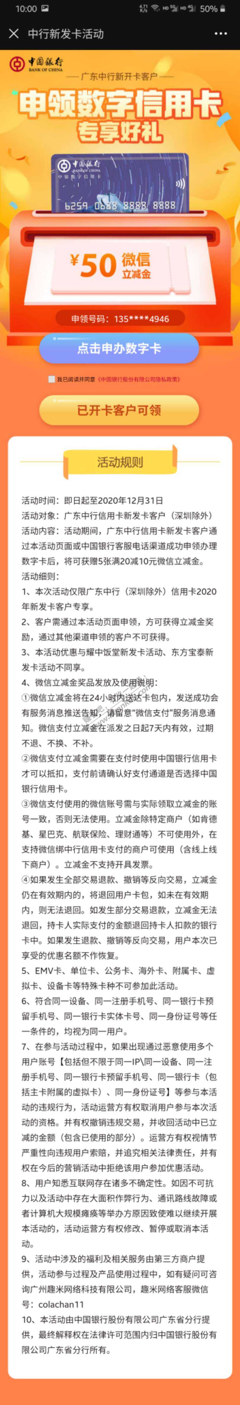 申办中国银行数字卡领50元微信立减金,仅限广东