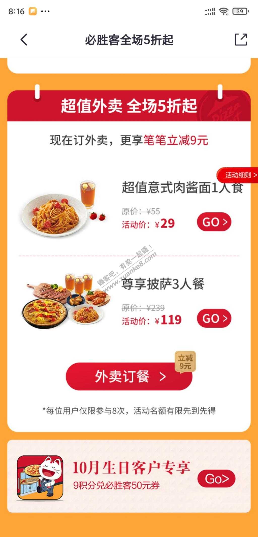 5、掌上生活搜必胜客,9积分购买必胜客50元外卖券