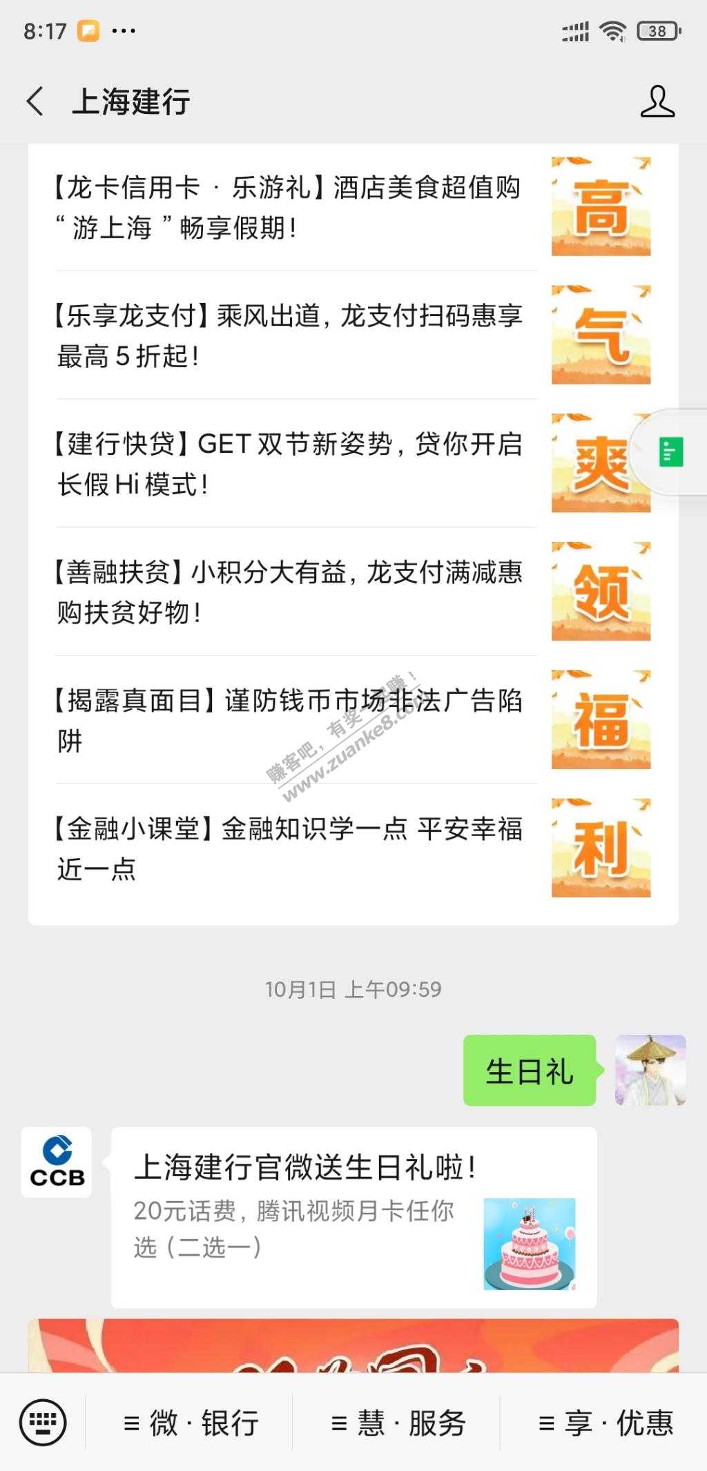 6、上海建行的用户,关注“上海建行”公众号,回复“生日礼”,20元话费和腾讯视频月卡选其一