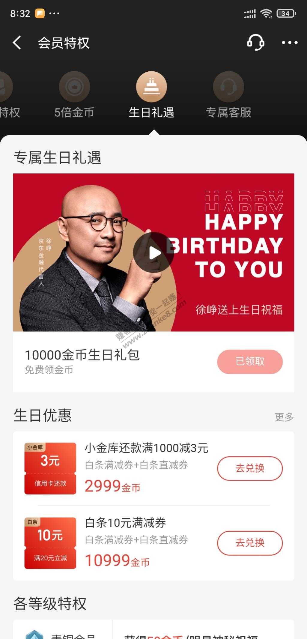 9、京东金融,点击我的,金币,送了10000金币生日礼包