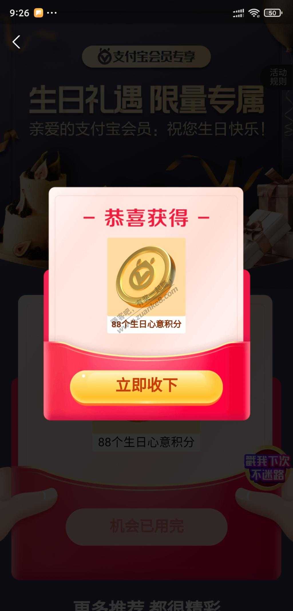 10、支付宝送了开屏生日祝福和88会员积分,点击会员中心领取
