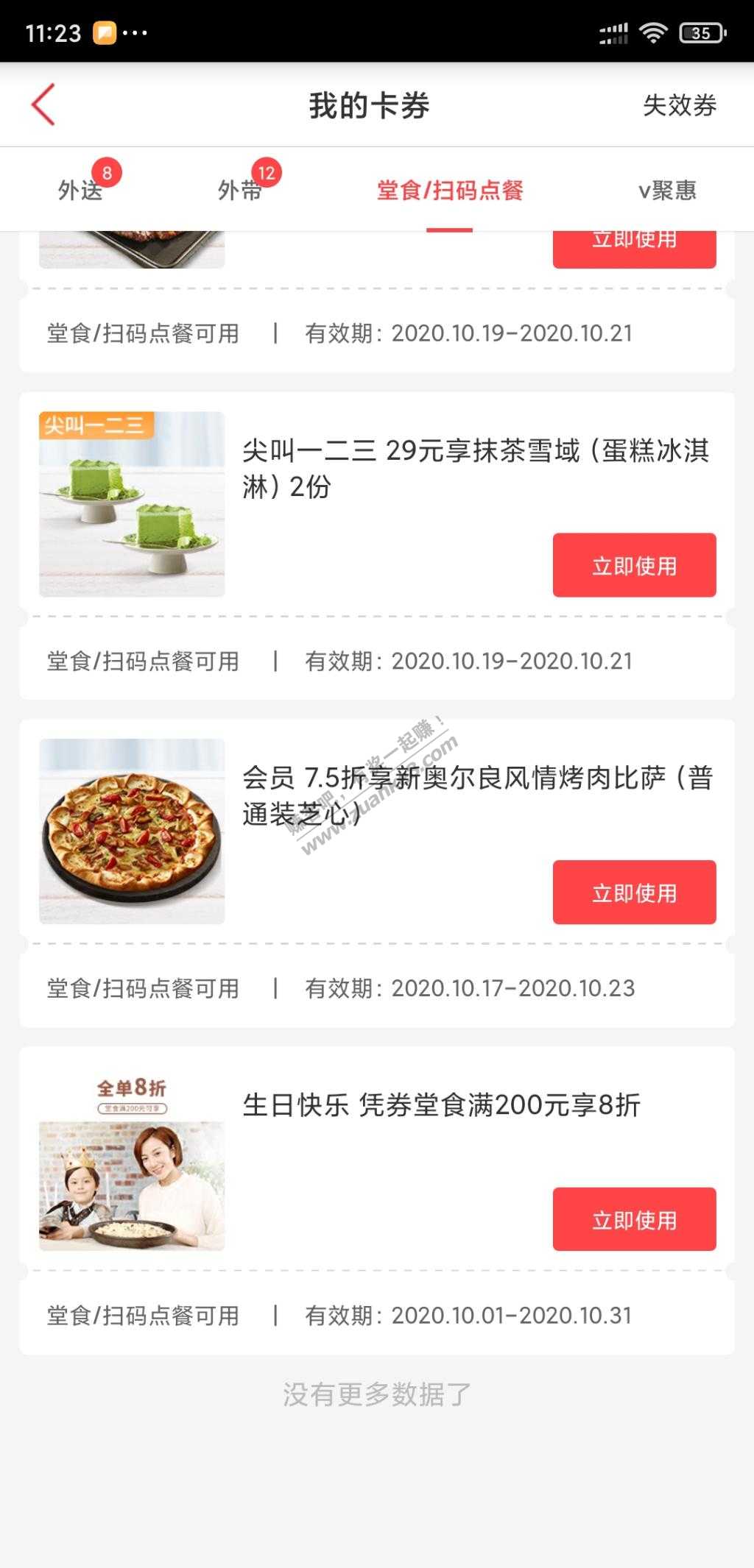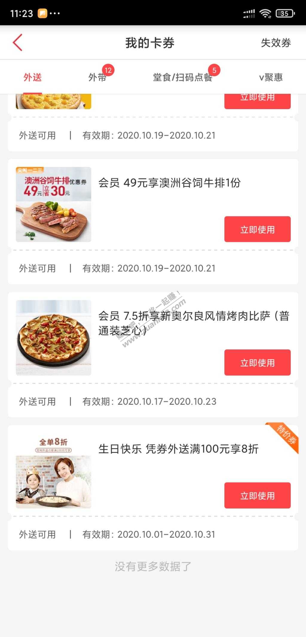 12、必胜客,点击我的卡券,送了外卖100元享8折和堂食200元享8折