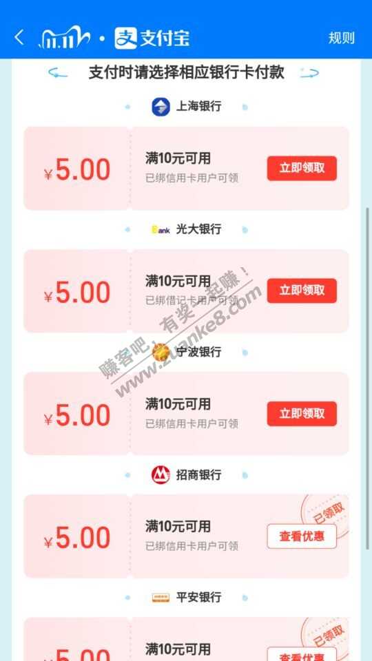 [ 支付宝5-30元毛 ]需绑定招商/平安/工商/上海/光大/宁波等借记或XY卡