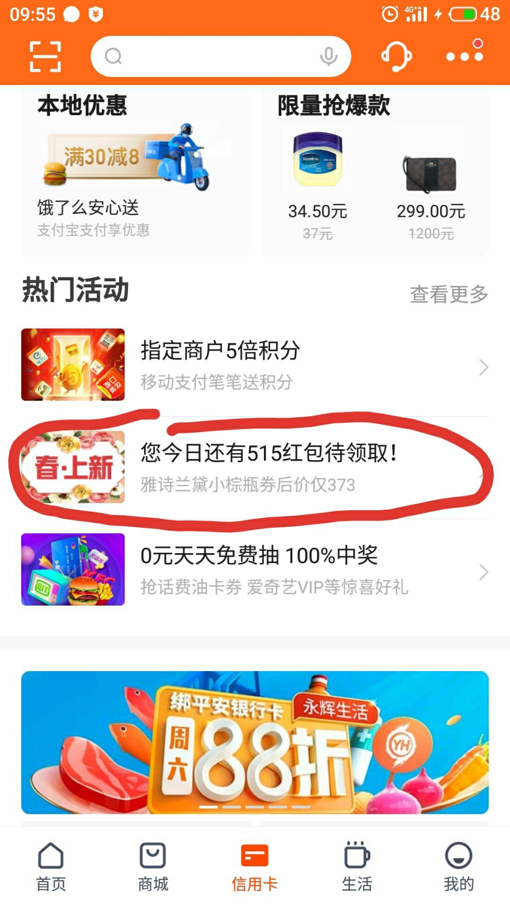 口袋银行app>xing/用卡>今日515红包待领取>进去往下拉,有个砸金蛋。我刚刚中了口罩。