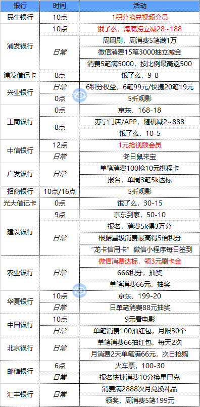 当月累计可计积分消费满人民币2,888元,次月可享2次以9元或9积分兑换电影、读书或运动权益,数量有限,先到先得(12月31日)