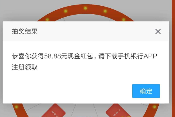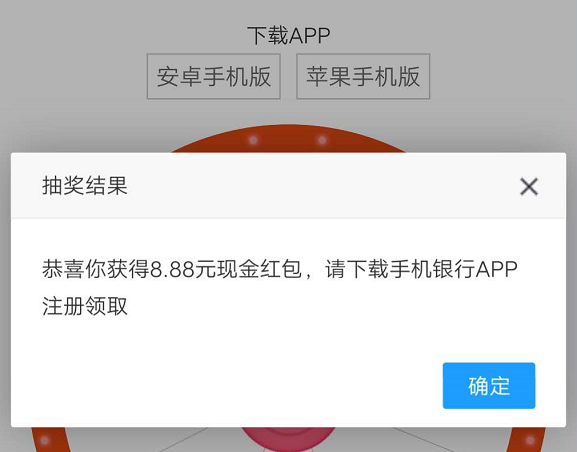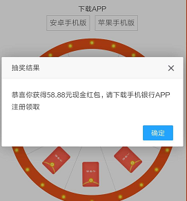 八等奖5.88元中奖概率挺大,感觉5等奖以上都可以开通手机银行了,没有卡也没关系,中奖了看中奖金额大小决定是否开通。
