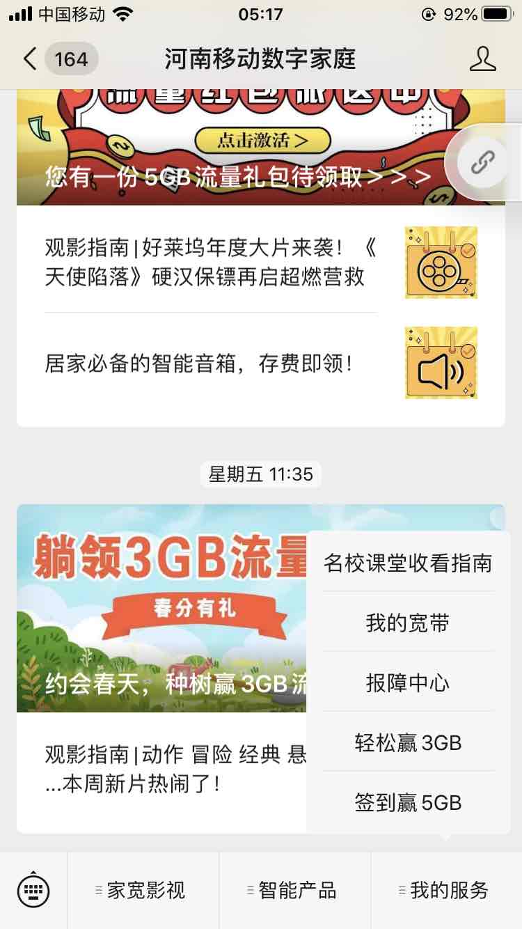 河南移动用户微信关注河南移动数字家庭,我的服务,轻松赢3gb,刚刚水了2g流量。