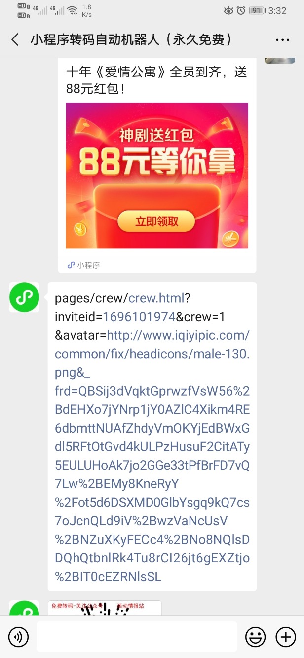 转链接教程:将小程序转到转码机器人上,会有个inviteid,然后将那串数字替换掉https://activity.m.iqiyi.com/web/crewGift.html?vfm=m_994_jzh&inviteid=1696101974最后这里的inviteid。乐意的走下链接,不乐意的自行下载APP参与。大约需要10-12个手机号,平台码不行,设备建议用红手指之类云手机