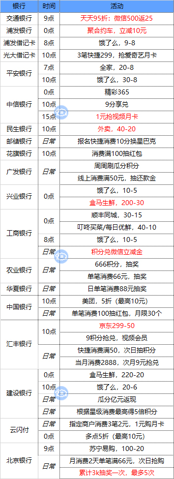 活动:周一/支付宝、周二/微信、周三/京东苏宁、周四/云闪付、周五周六/买单吧、周日/美团(4月30日截止)