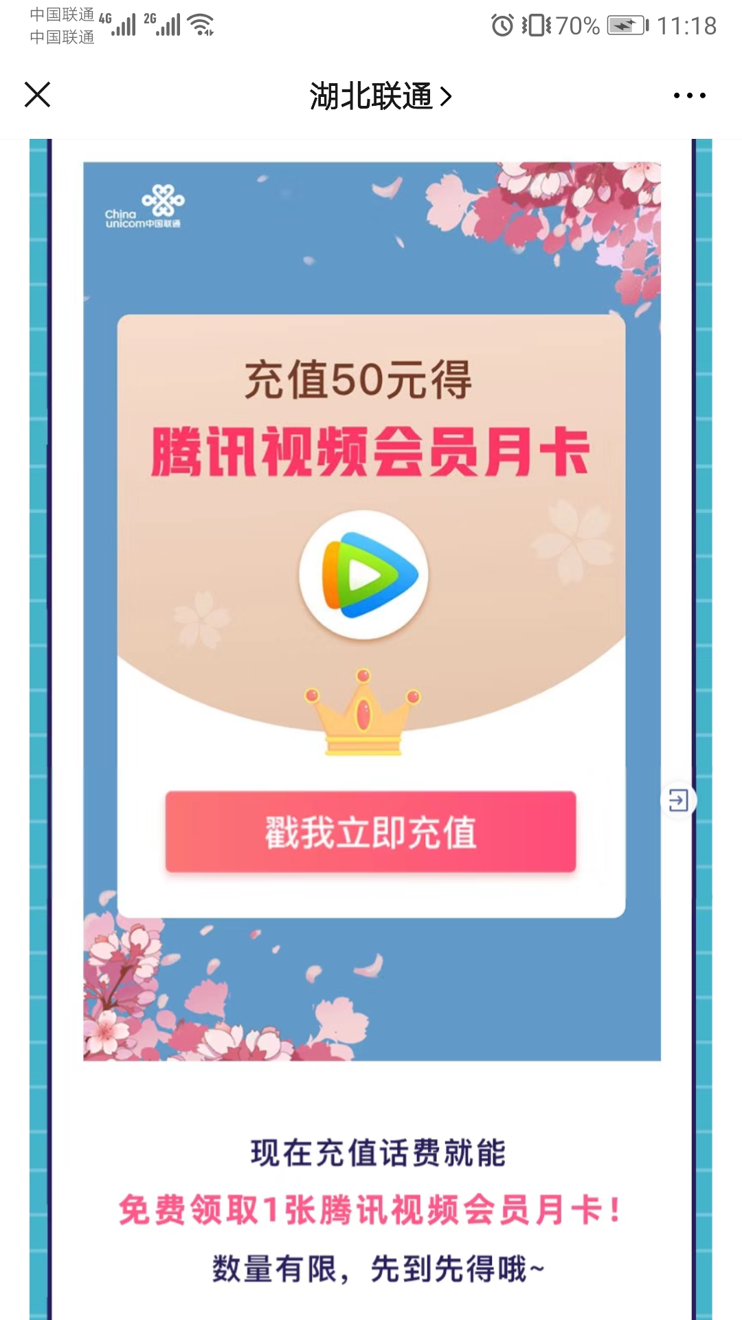 湖北联通微信公众号充值50话费得腾讯视频月卡