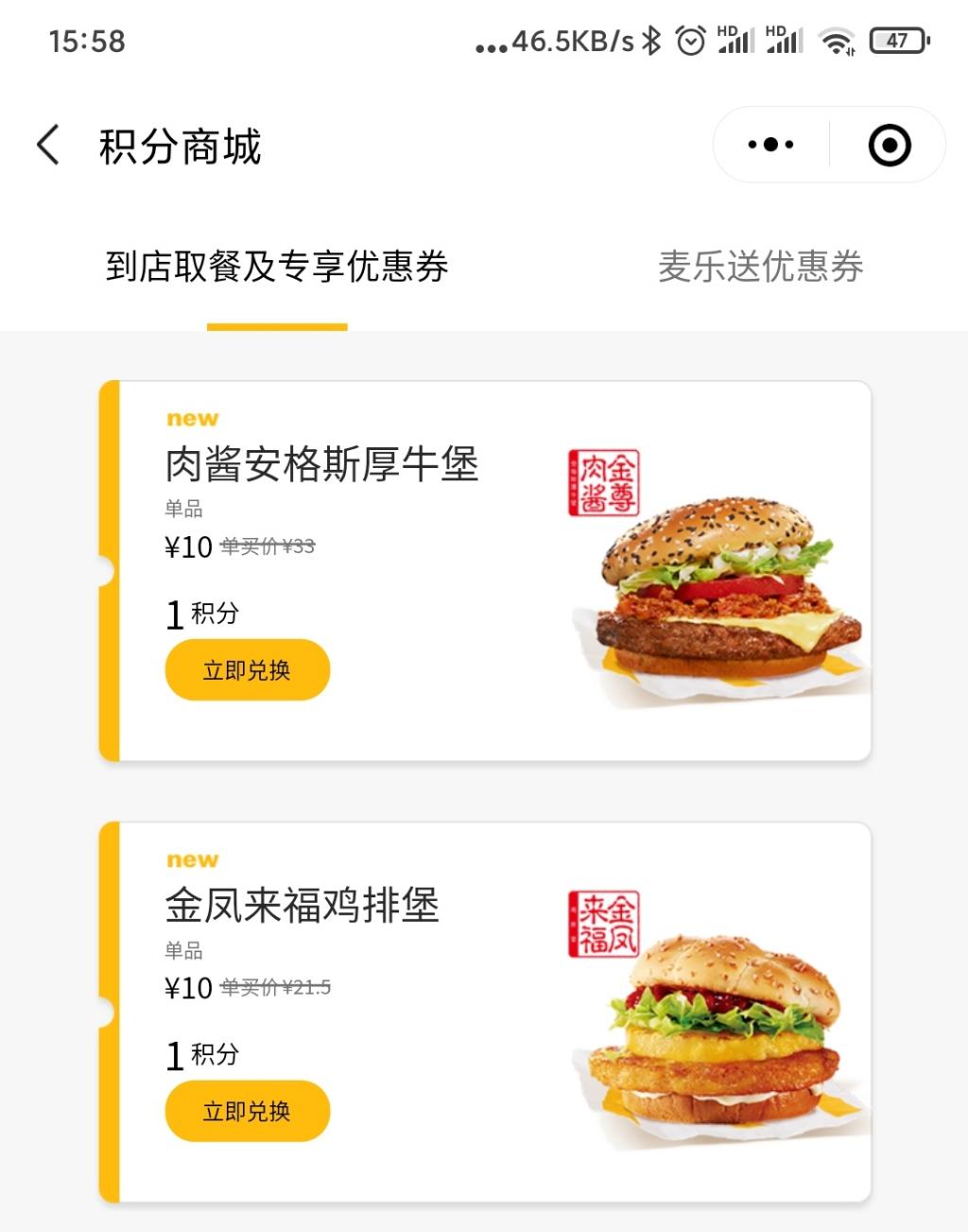 路径:麦当劳小程序 - 积分商城 - 使用1积分兑换优惠券