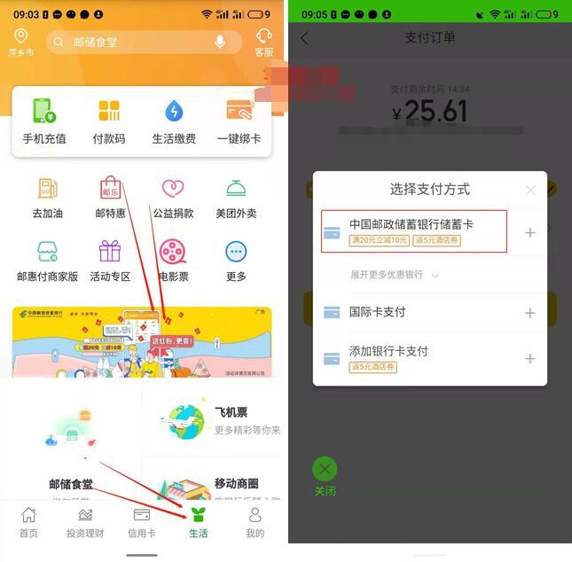 打开邮储银行APP--生活--中间滚动图“享满20立减10元”--美团外卖满20元--支付的时候绑定邮政卡会提示满减--支付后会显示优惠10元(没有显示优惠的就不要去下单)