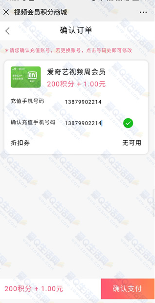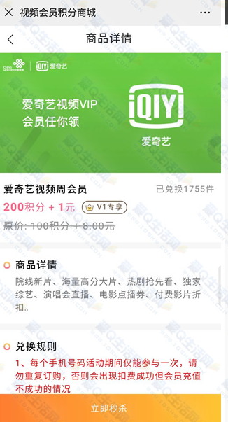 在活动页面参与200积分+1元即可秒杀爱奇艺或优酷会员周卡