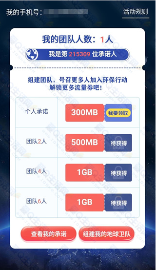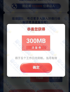 首次承诺的可领取到个人流量300MB,领取后5个工作日到账,可建立自己的团队领取更多