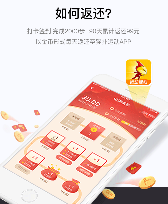 累计90天返还99元 以金币形式每天返还到猫扑运动APP里面(可以提现到微信或支付宝)