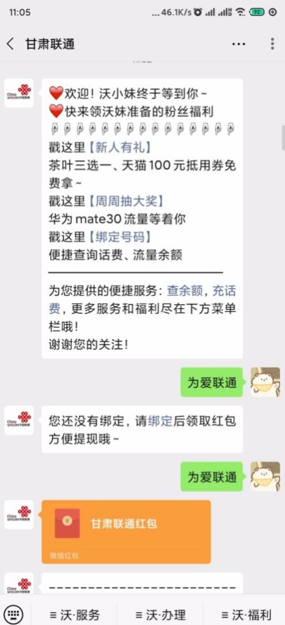 关注公众号 甘肃联通 绑定领微信零钱红包