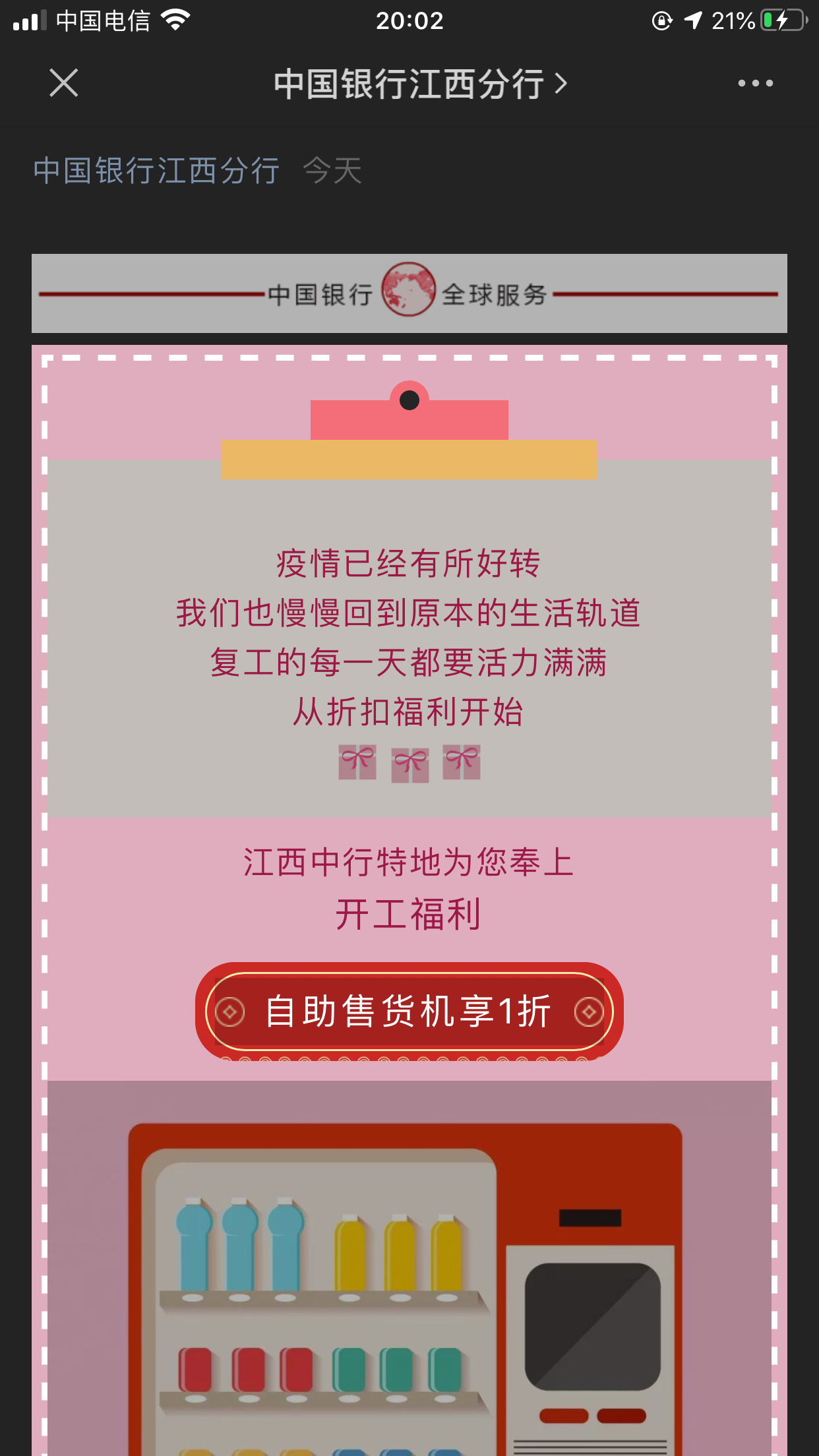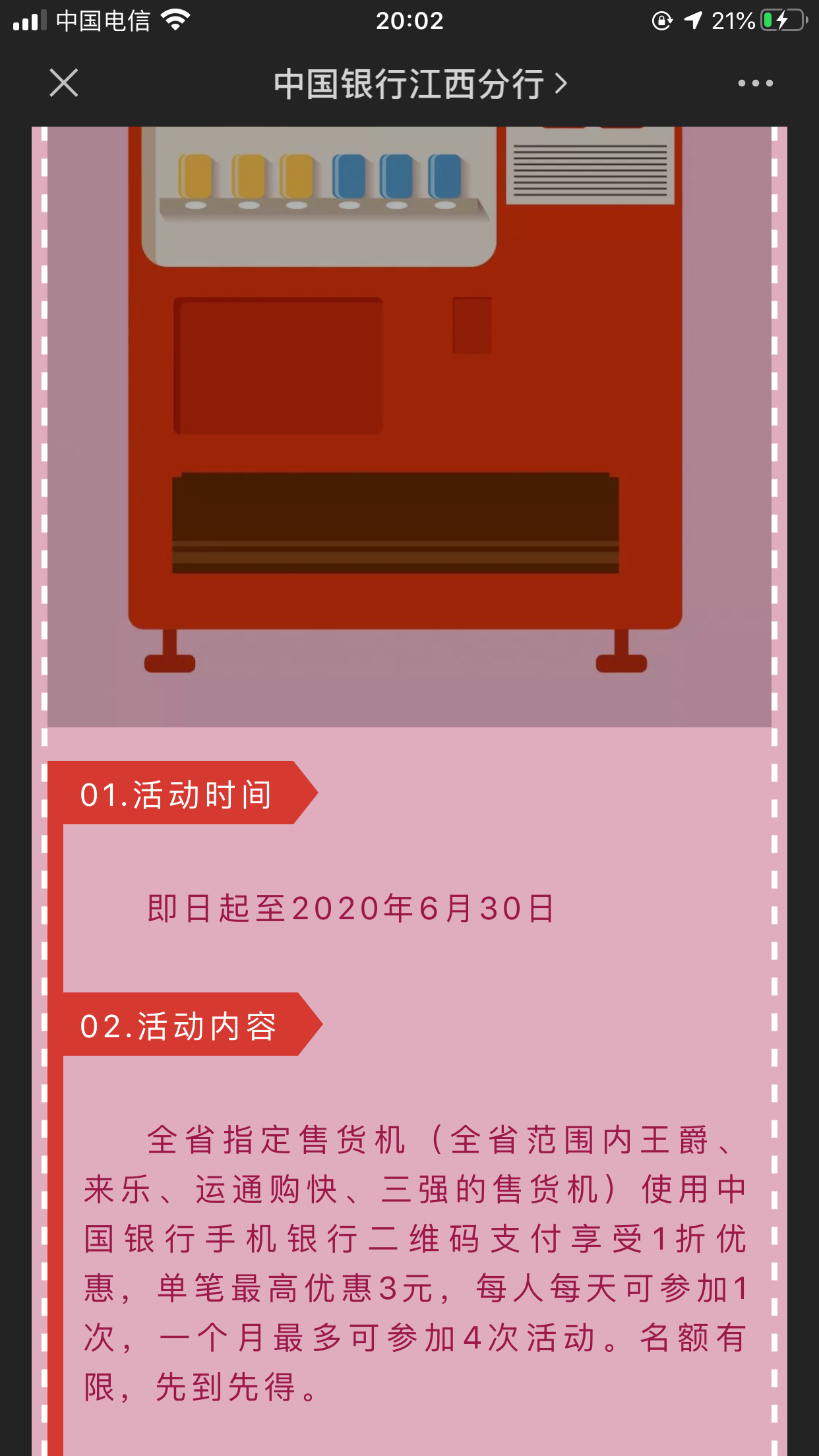 全省指定售货机(全省范围内王爵、来乐、运通购快、三强的售货机)使用中国银行手机银行二维码支付享受1折优惠,单笔最高优惠3元,每人每天可参加1次,一个月最多可参加4次活动。名额有限,先到先得。