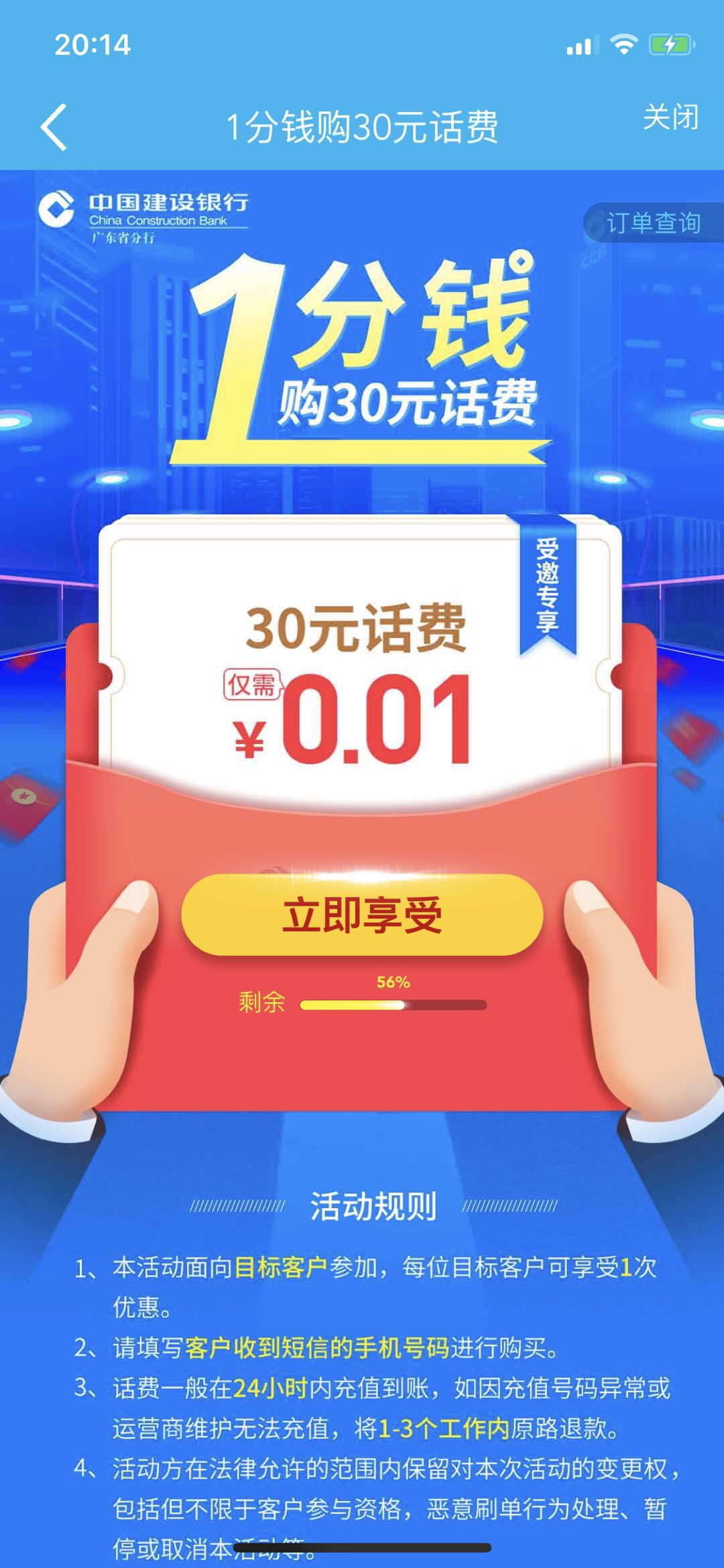 【特邀客户30元话费赠礼】尊敬的客户:感谢您对建行长期以来的支持!现登录建行手机银行,进入“悦享生活-优惠充值中心”广告专区可参与“1分钱购30元话费”优惠活动,活动截止3月底,优惠仅限本人一次。