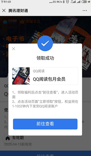 腾讯理财通秒领1个月QQ阅读VIP会员