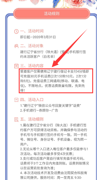 辽宁建行卡福利!四分钱冲30元话费