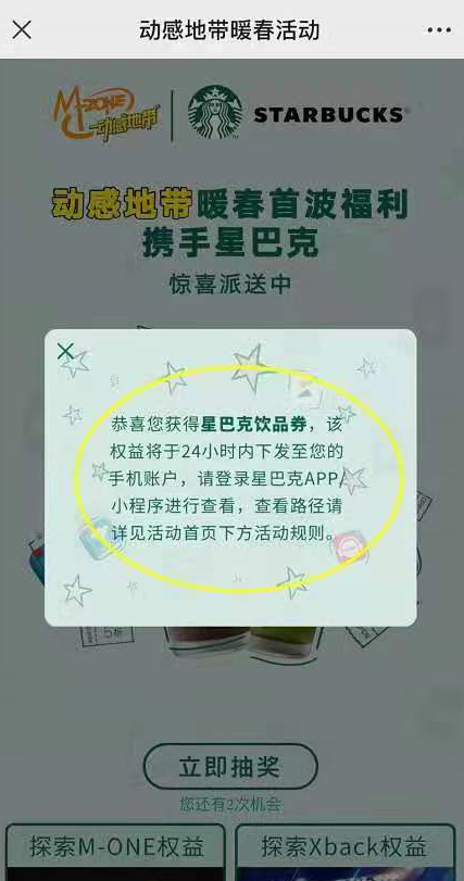 全国移动抽星巴克买一送一券,亲测必中,24小时内到账