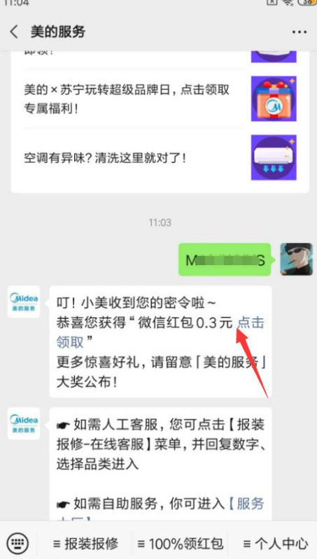 微信扫码打开->下拉页面->都乱写->编号随便18位->图也随便->复制口令->发送给公众号->美的服务->点推文进去领